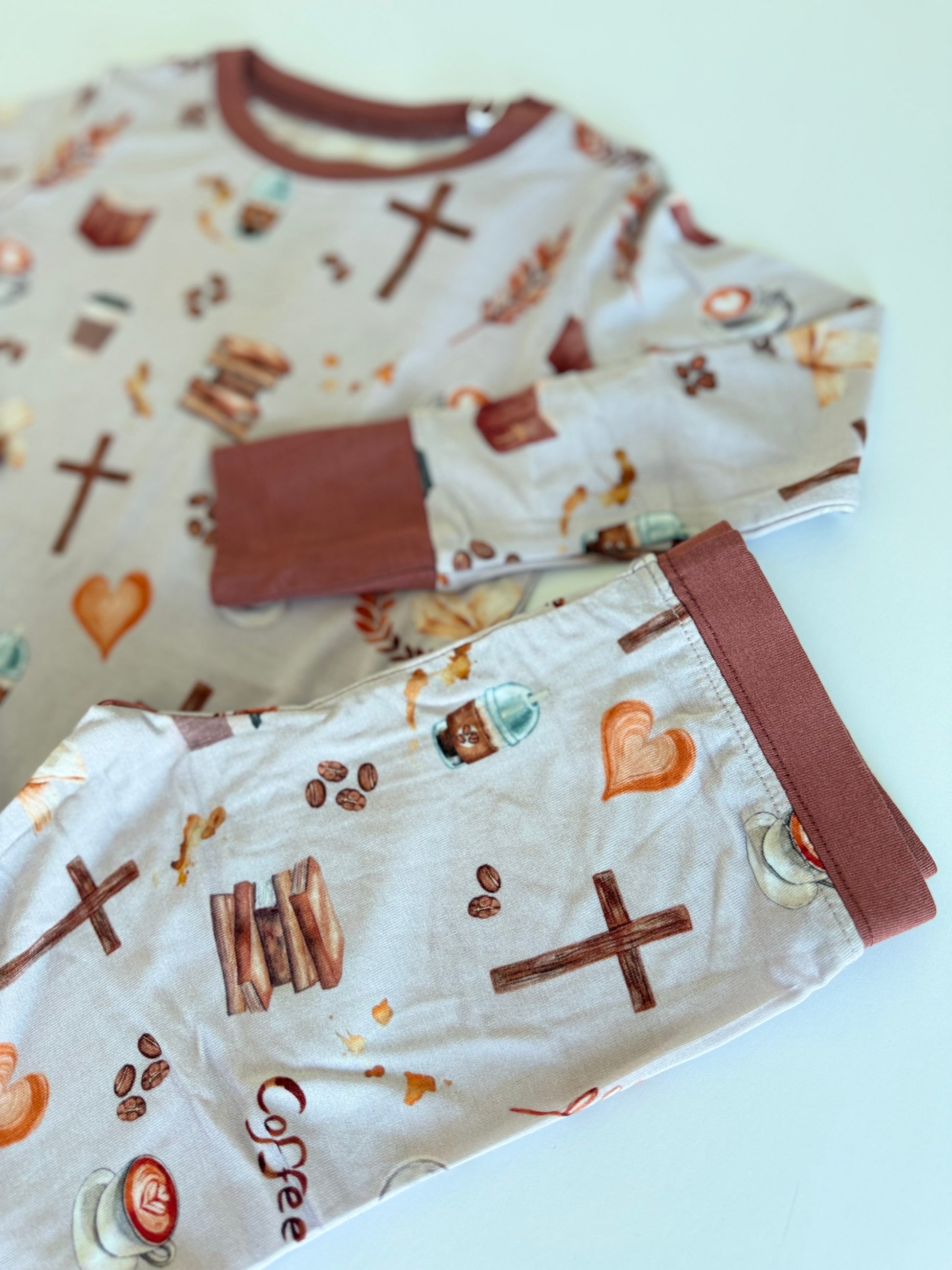 Our Sunday Sips Two-Piece Pajama Set is made for slow mornings and cozy nights. Featuring a warm neutral print inspired by quiet coffee moments, this set is crafted from buttery-soft, stretchy fabric with a snug-fit long sleeve top and matching pants for all-night comfort.