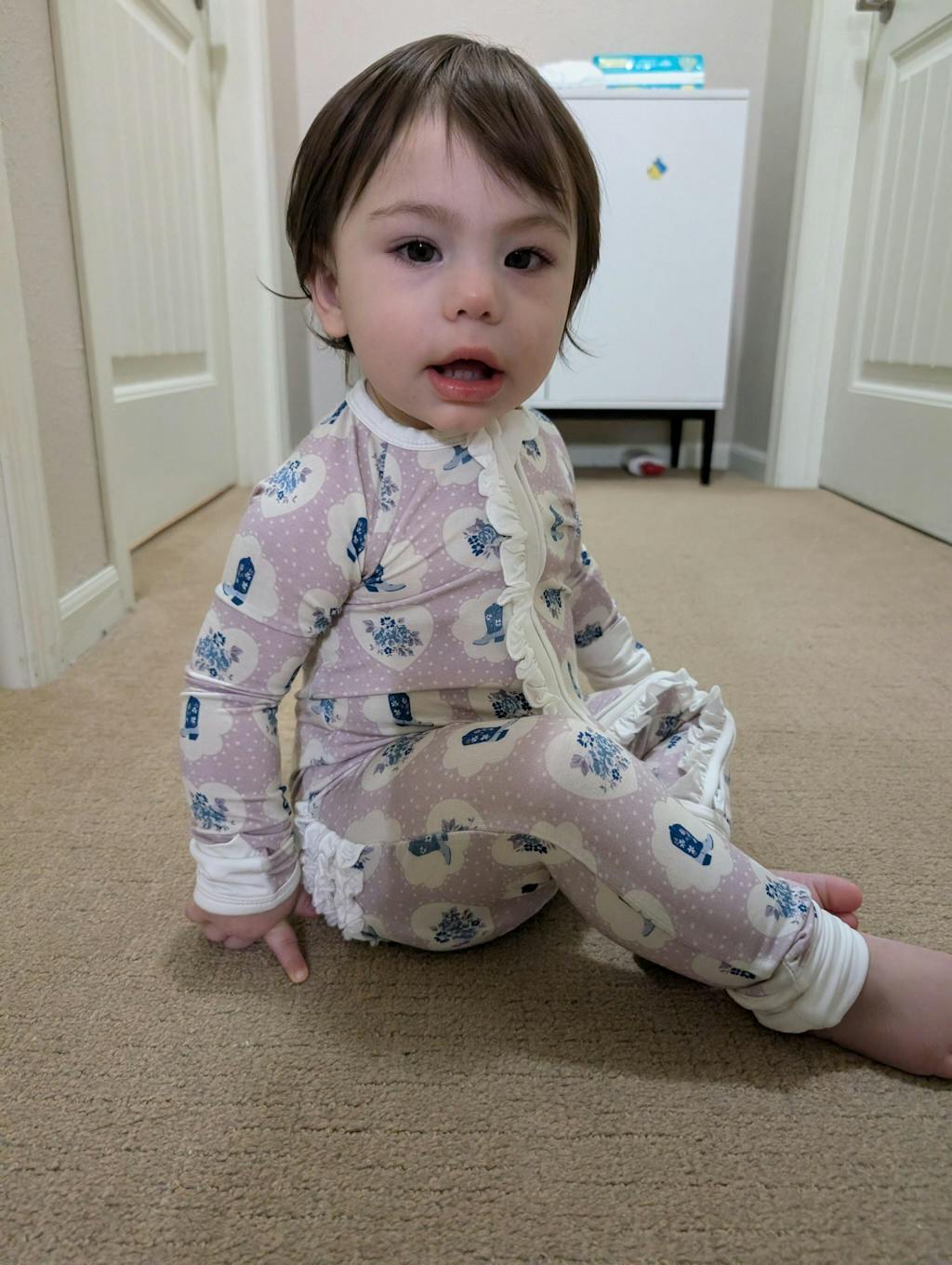 Designed with an asymmetrical zipper for easy changes, the romper is accented with a sweet ruffle along the zipper line and layered ruffles across the back for an extra dose of charm. Made from soft, breathable fabric and finished with contrast cuffs for a snug fit, it’s perfect for playtime, nap time, or photo ops on the prairie.